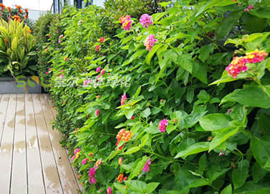 植物品種:茶梅、杜鵑、月季、噴雪花、大花六道木、紅花檵木、凌霄花、三角梅、花葉蔓長春、美人蕉、矮牽牛、常春藤、吊蘭、綠蘿等。