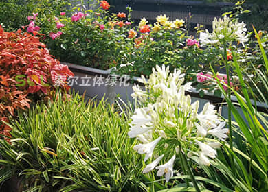 屋頂花園,考慮到屋頂?shù)某兄亍⒘Ⅲw景觀效果及遮擋容器,植物要有高低層次,觀葉植物色彩要多樣,觀花植物花朵顏色多、或花朵數(shù)量多、或花朵較大。