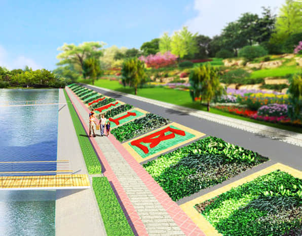 河堤綠化,考慮到養護管理及防止水土流失的問題,植物要以耐寒、喜光的草本、爬藤、小灌木為主,可以選擇紫竹梅、云南黃馨、三角梅、小葉扶芳藤、金邊闊葉麥冬等,以及景天科植物,如佛甲草、八寶景天、黃花景天、紅葉景天、細葉垂盆草等。