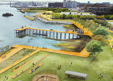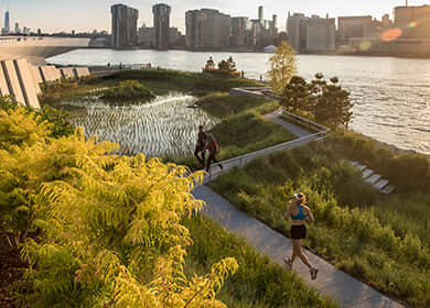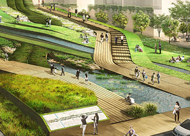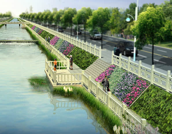 河堤綠化,可以在江、河、湖、渠(干支以上)的堤上,配合自然環境,種植適合當地條件的灌木和草本植物,以保土護堤,增強防護能力,同時提升河道生態景觀。