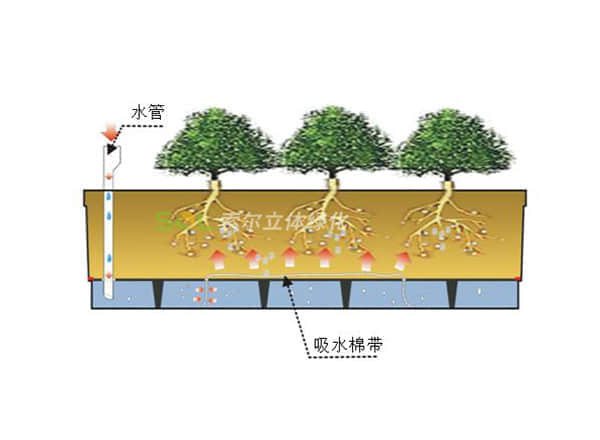 河堤綠化,灌溉時將水從進水口注入,水通過進水管進入滲灌管,通過滲灌管滲灌。同時通過底部水槽儲水及棉帶吸水,為植物提供水分。