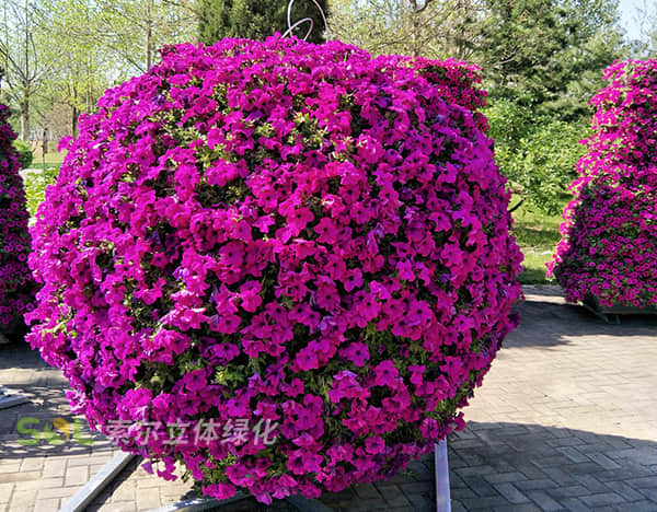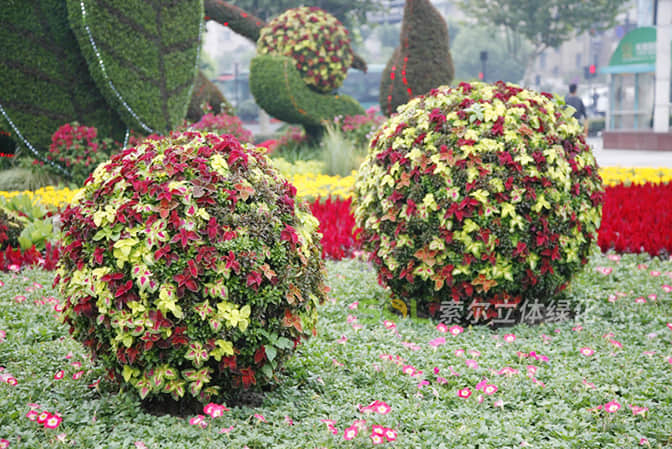 花球既能獨立成景,又可在綠雕中應(yīng)用,方式多樣。節(jié)日、慶典、會議、活動等重要項目都可運用,用紅色系、橙色系、黃色系等花卉,烘托熱烈氣氛。